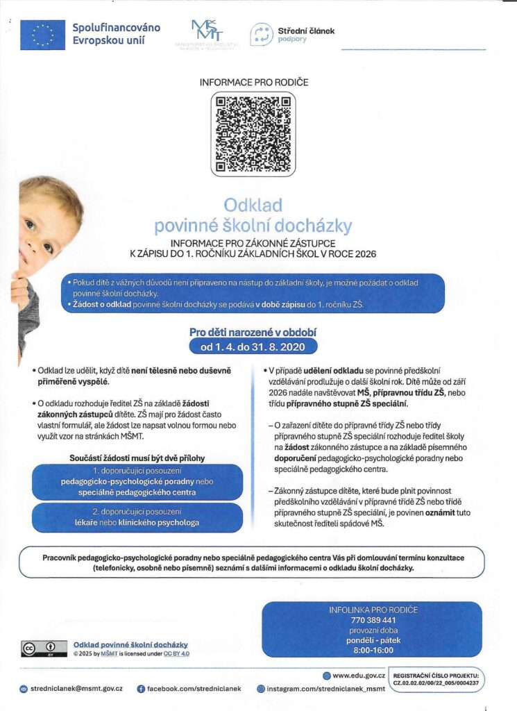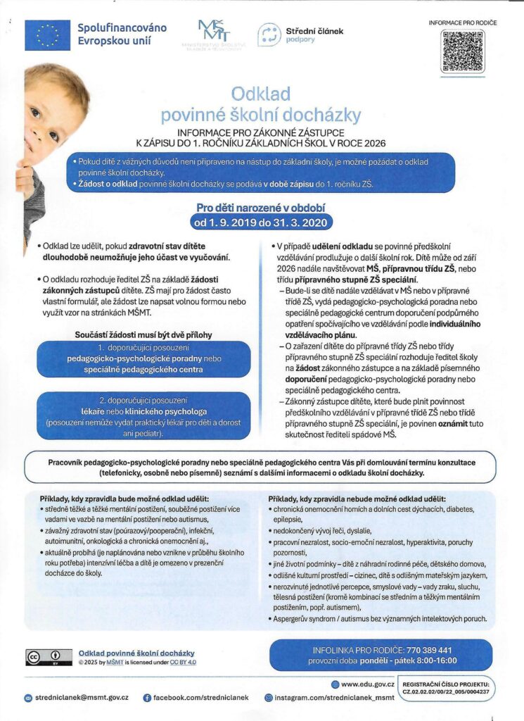 Informace MŠMT: ODKLAD povinné školní docházky v roce 2026
